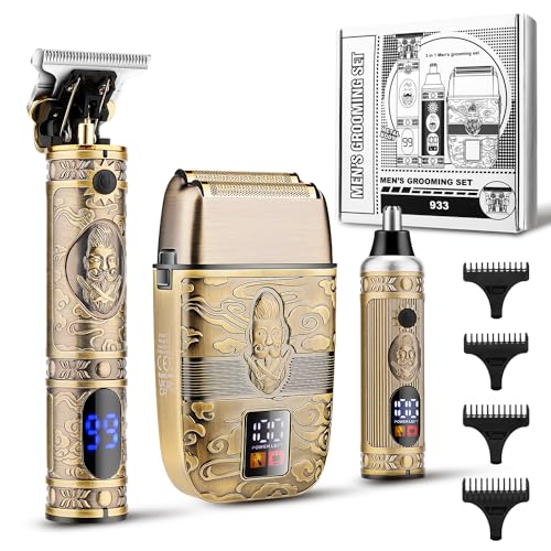 - PROFESSIONAL BARBER CLIPPERS & TRIMMER SET - Men's Trimmer Grooming Set includes barber clippers, men's nose hair trimmer, and dual blade aluminum foil razor.The T-Blade Beard Trimmer makes it easy to trim hair, beards, artistic carvings, sideburns, precision trimming, and body trimming. Ear and Nose Trimmer for precise, gentle trimming of ear and nose hairs. Electric bald aluminum foil razor for beard trimming.